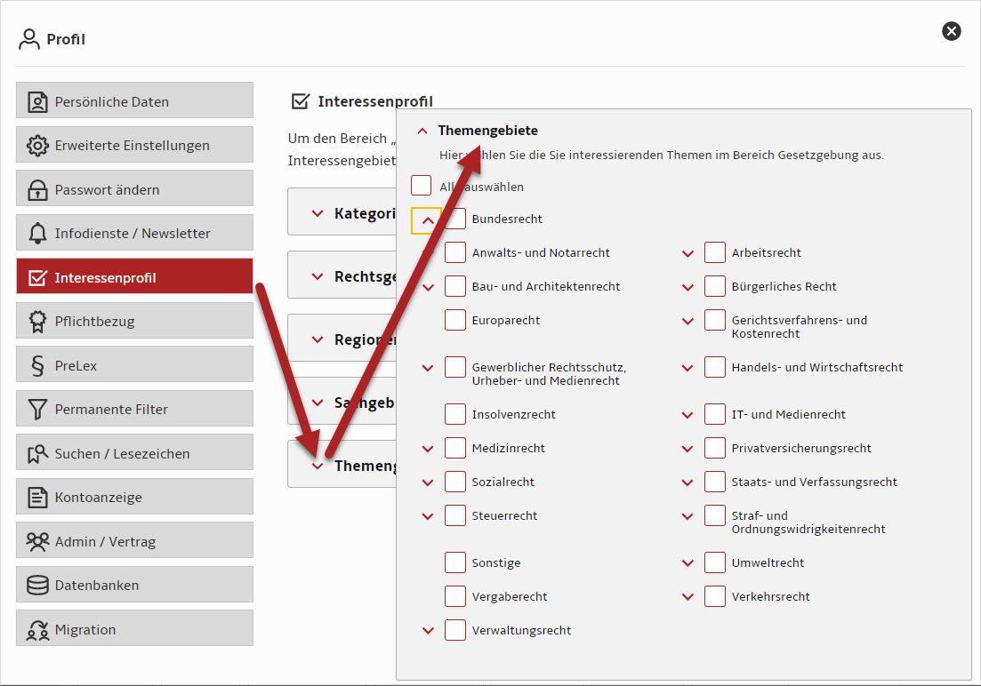 Wählen Sie die Themengebiete der Bundesgesetzgebung, die Sie besonders interessieren.