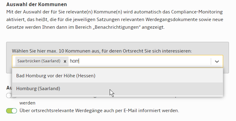 Mit der Auswahl der für Sie relevante(n) Kommune(n) wird automatisch das Compliance-Monitoring aktiviert, das heißt, die für die jeweiligen Satzungen der ausgewählten Kommunen relevanten Werdegangsdokumente sowie neue Gesetze des Bundes und des betroffenen Landes werden Ihnen im Bereich „Benachrichtigungen“ angezeigt. Die initiale Auswahl der zu überwachenden Kommunen können Sie hier jederzeit anpassen/ändern.