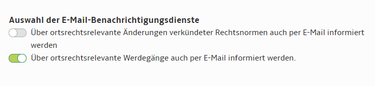 Zudem können Sie E-Mail-Benachrichtigungsdienstezu den ortsrechtsrelevanten Änderungen verkündeter Rechtsnormen oder Werdegänge aktivieren oder deaktivieren. Schieben Sie hierzu den passenden Schieberegler in die gewünschte Position.