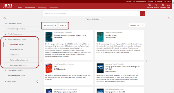 Vor oder nach einer Recherche führt die Auswahl einer (Unter-)Kategorie dazu, dass die Trefferliste auf den entsprechenden Dokumenttyp eingeschränkt wird. Weitere Hinweise hierzu im Hilfethema Suche.