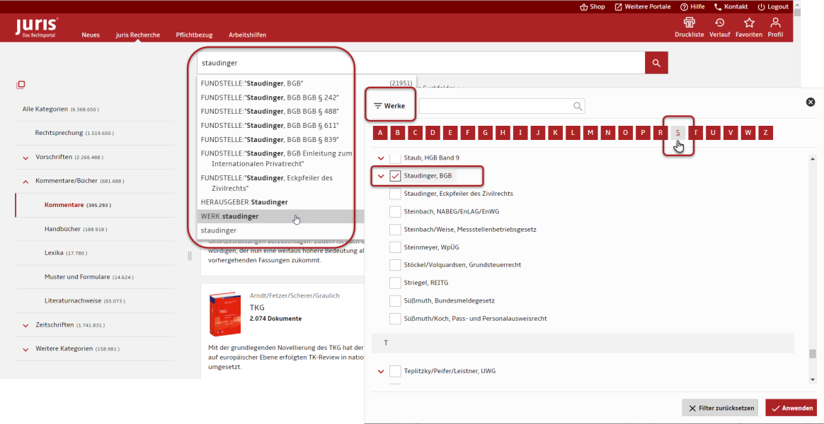 Eine gezielte Werkauswahl ist entweder durch die Eingabe eines konkreten Werknamens in die Suchzeile (zum Beispiel Staudinger) oder durch Auswahl eines Werks über die Werkliste oder im Werkfilter möglich.